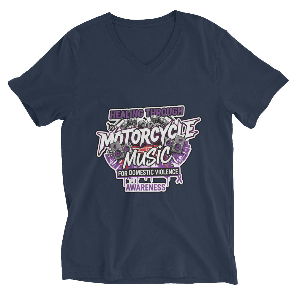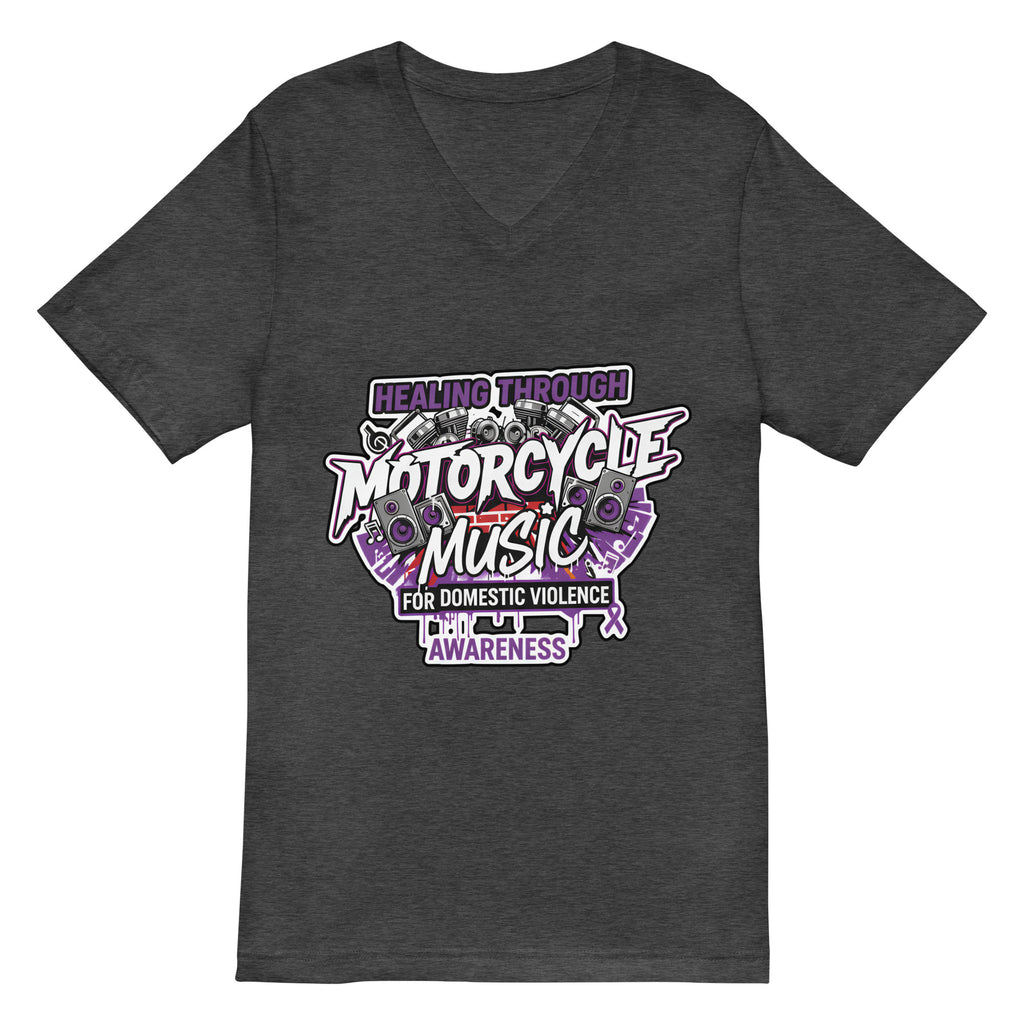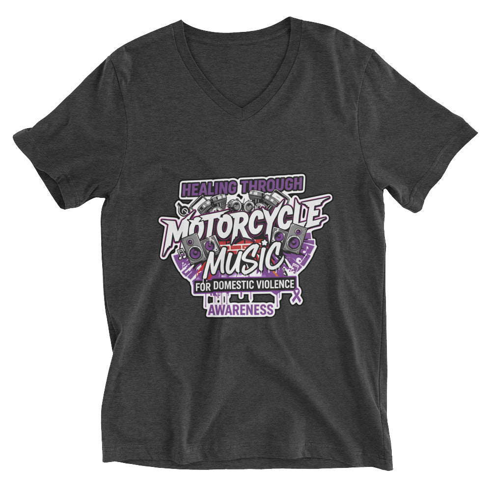 Healing Through Motorcycle Music Domestic Violence Awareness Unisex Short Sleeve V-Neck T-Shirt
