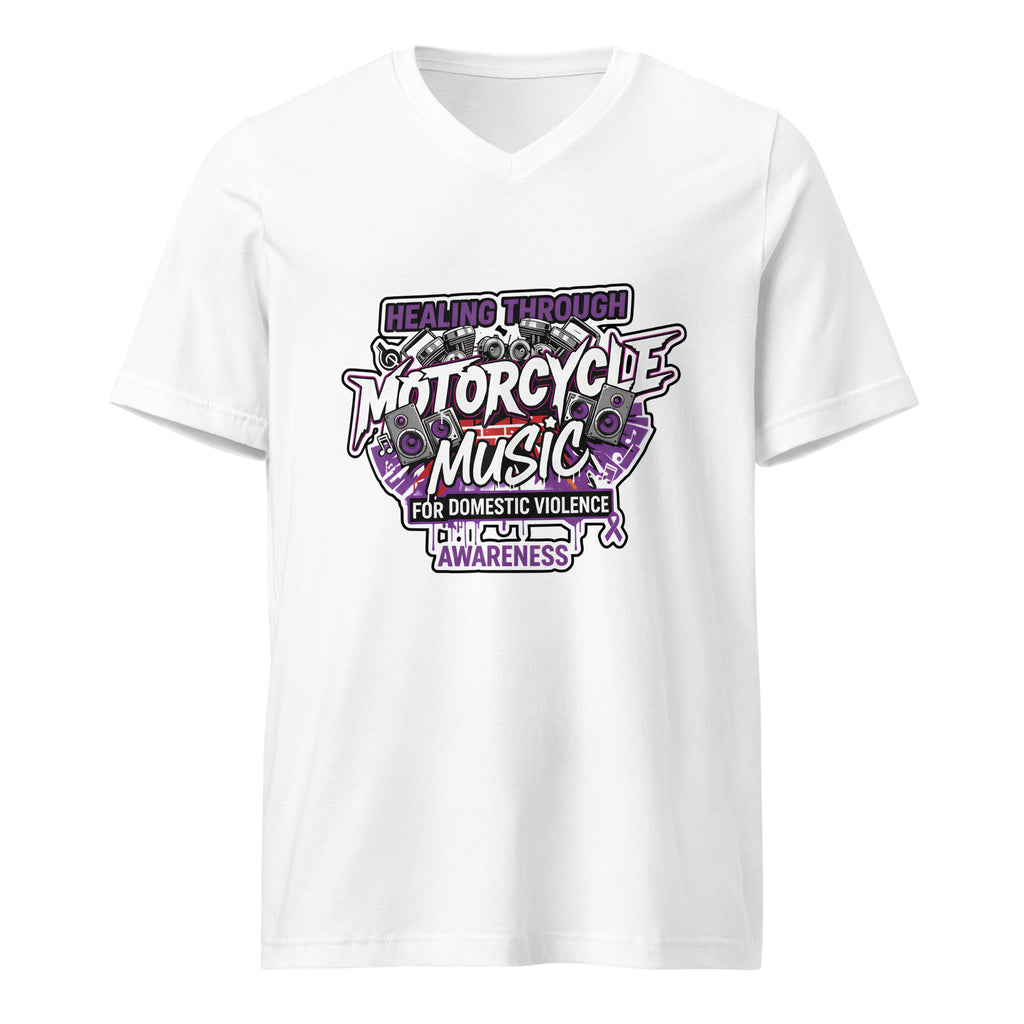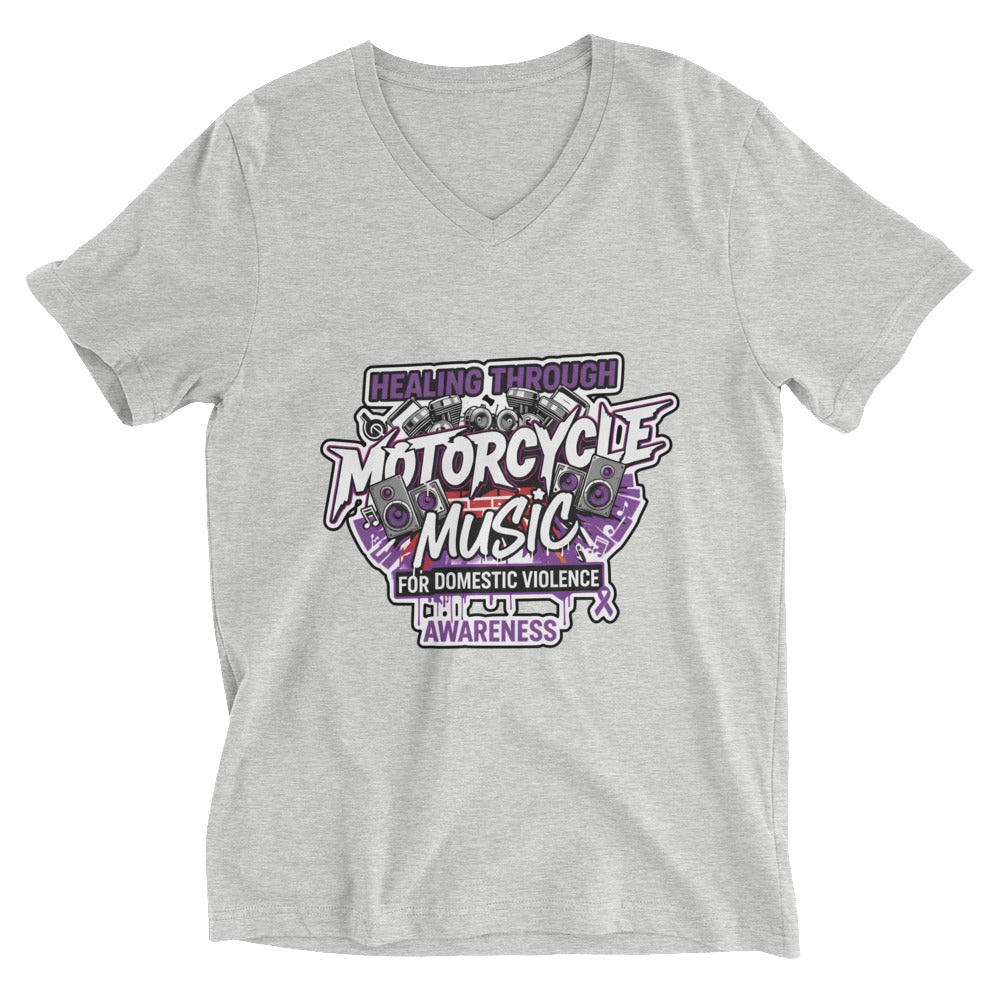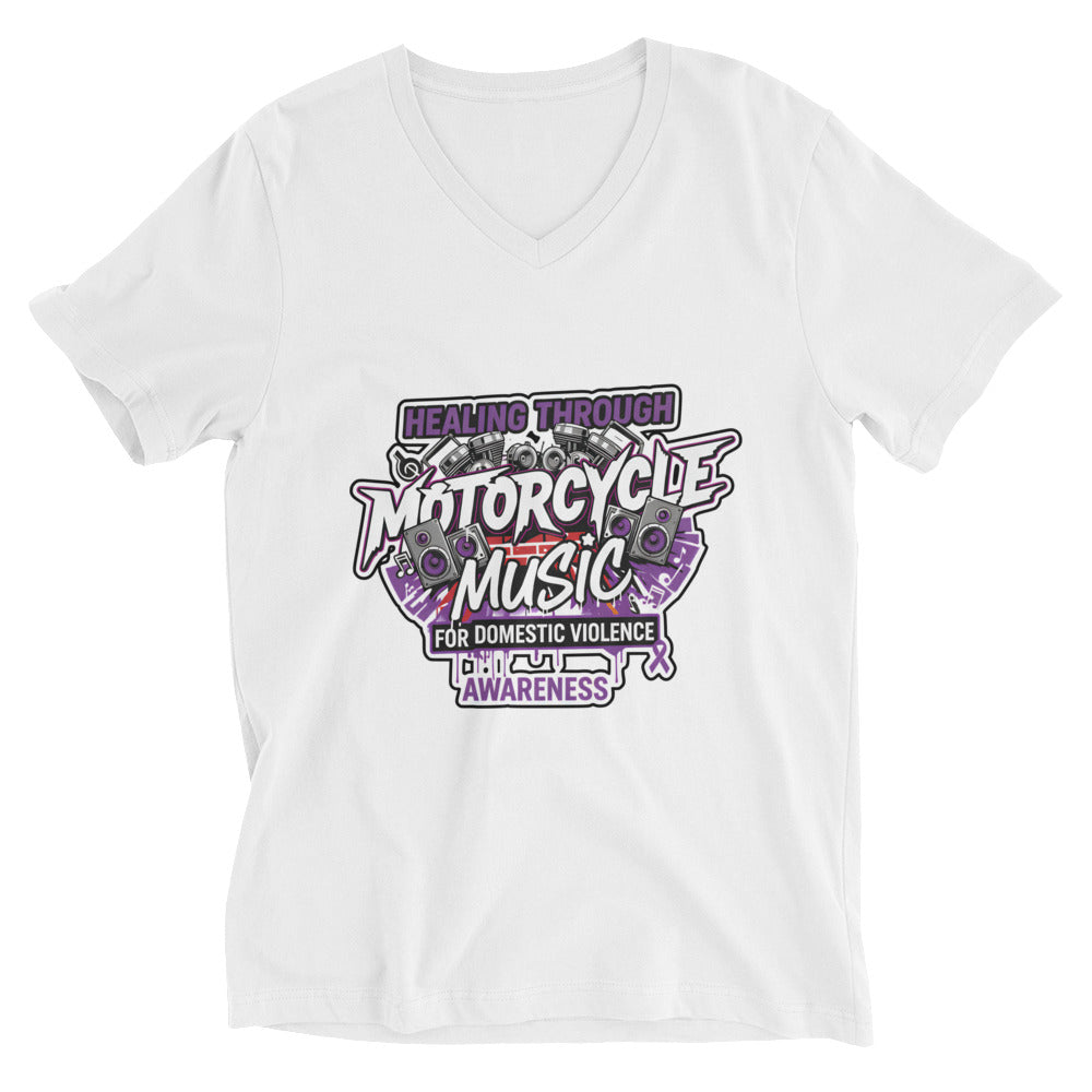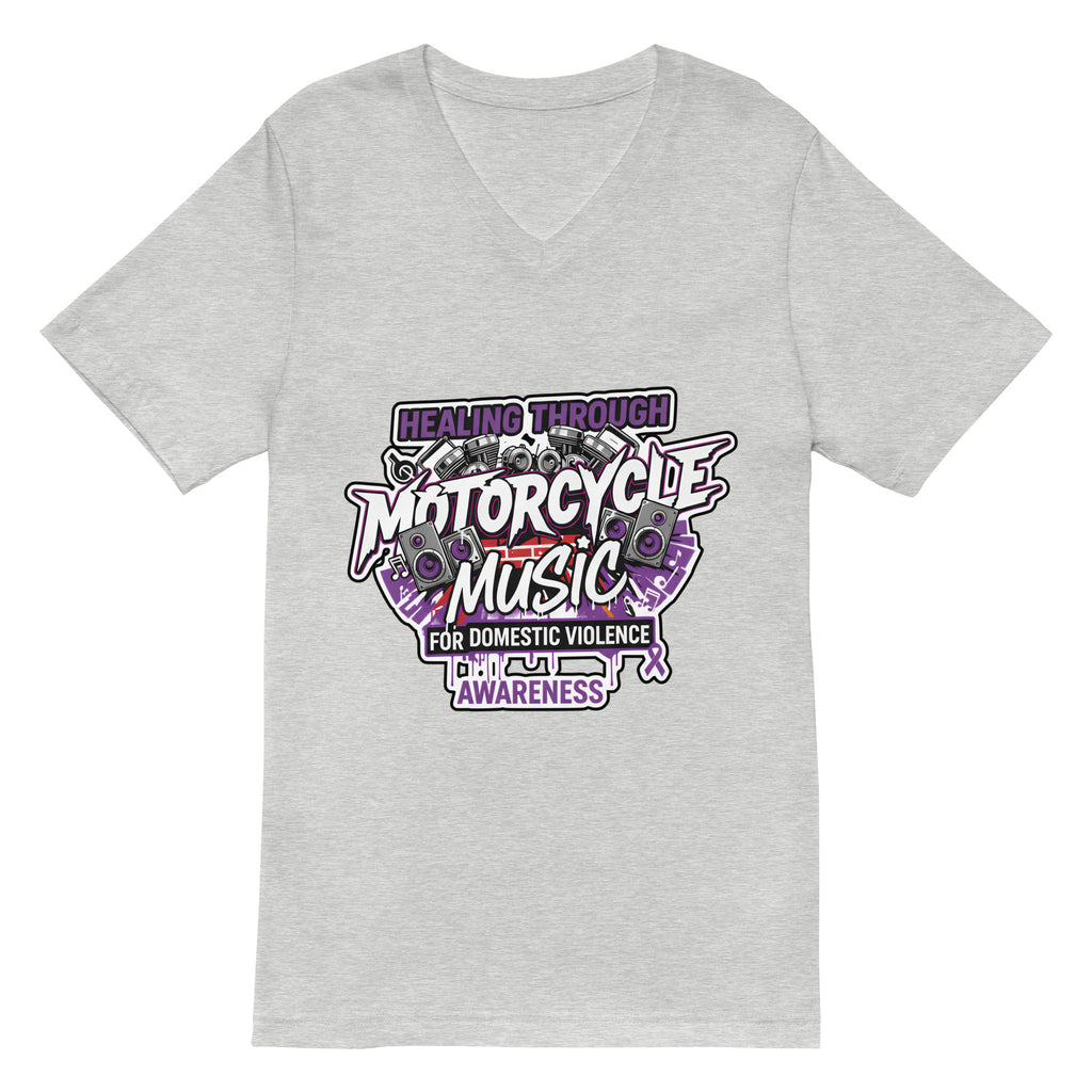 Healing Through Motorcycle Music Domestic Violence Awareness Unisex Short Sleeve V-Neck T-Shirt